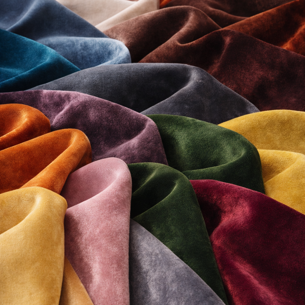 Velvet brings softness and richness, especially in deeper tones like wine and forest green.