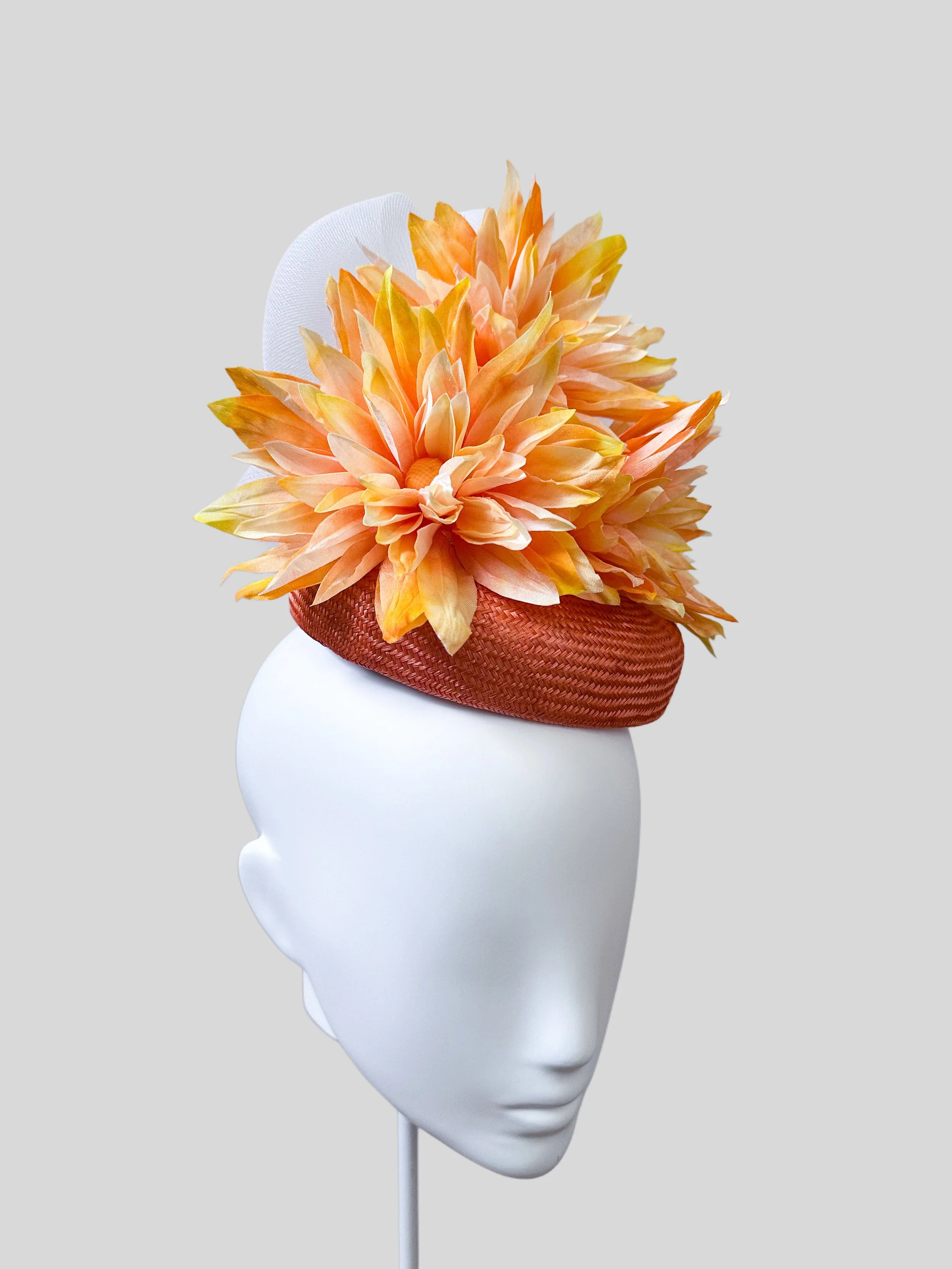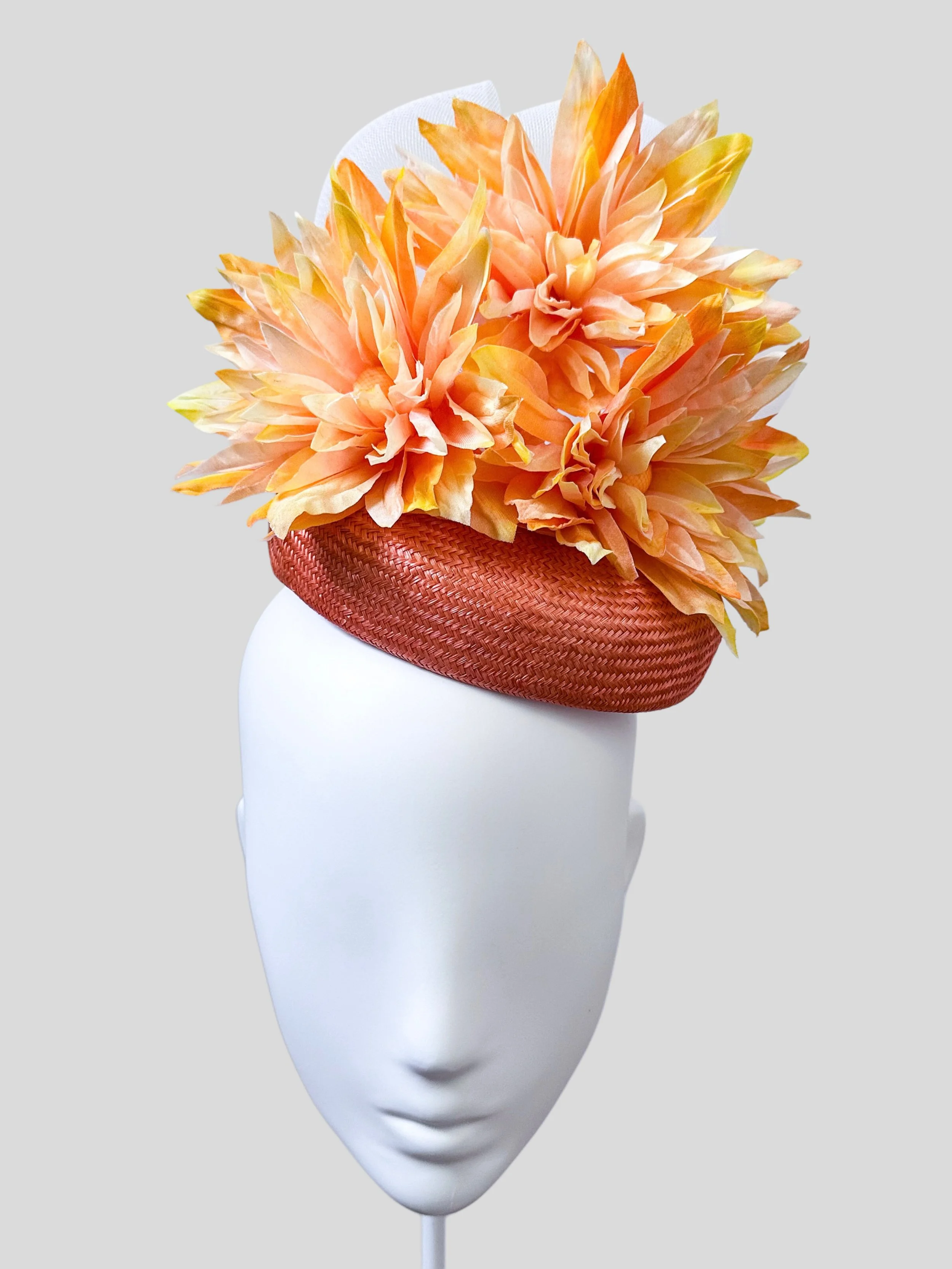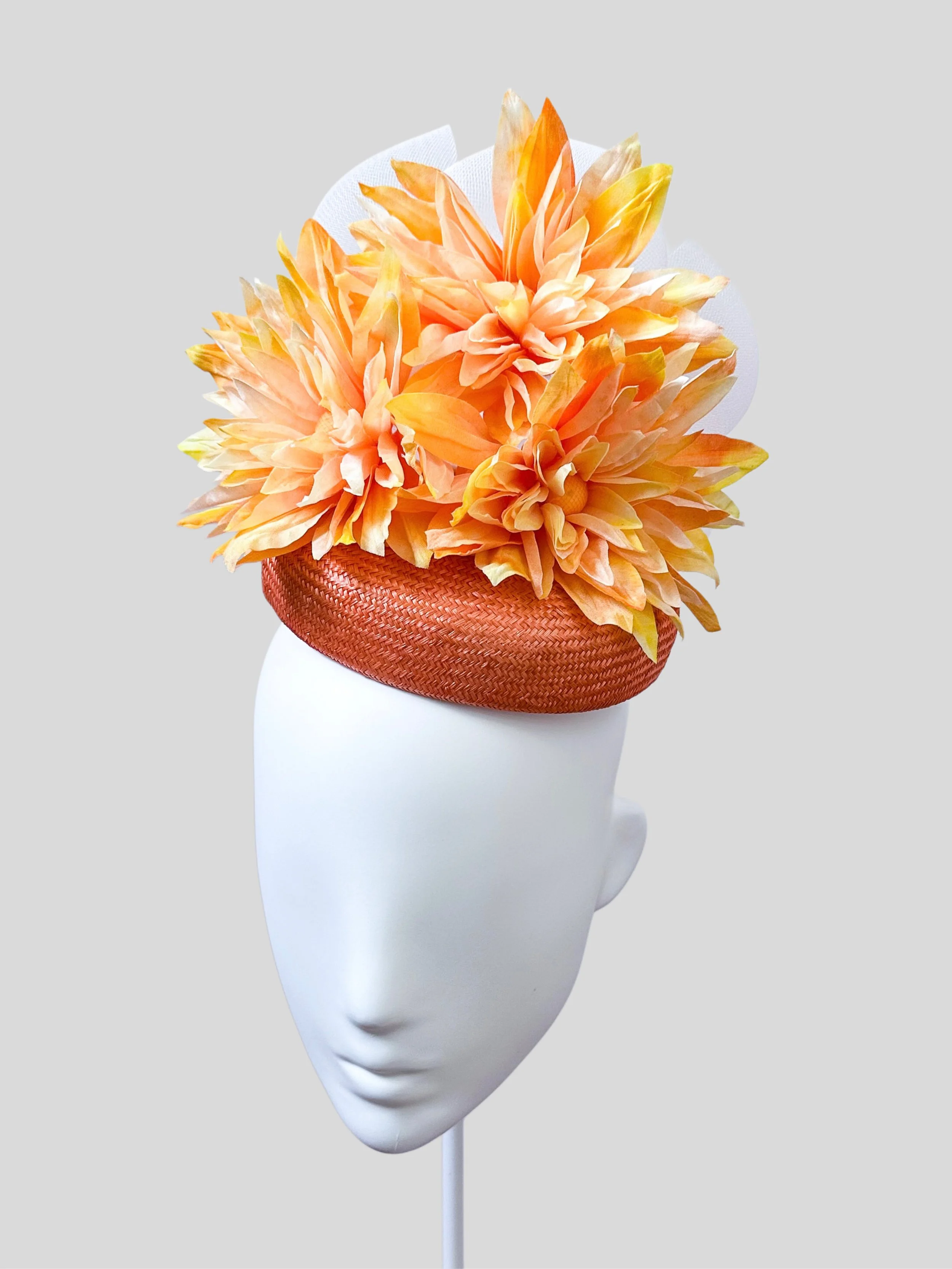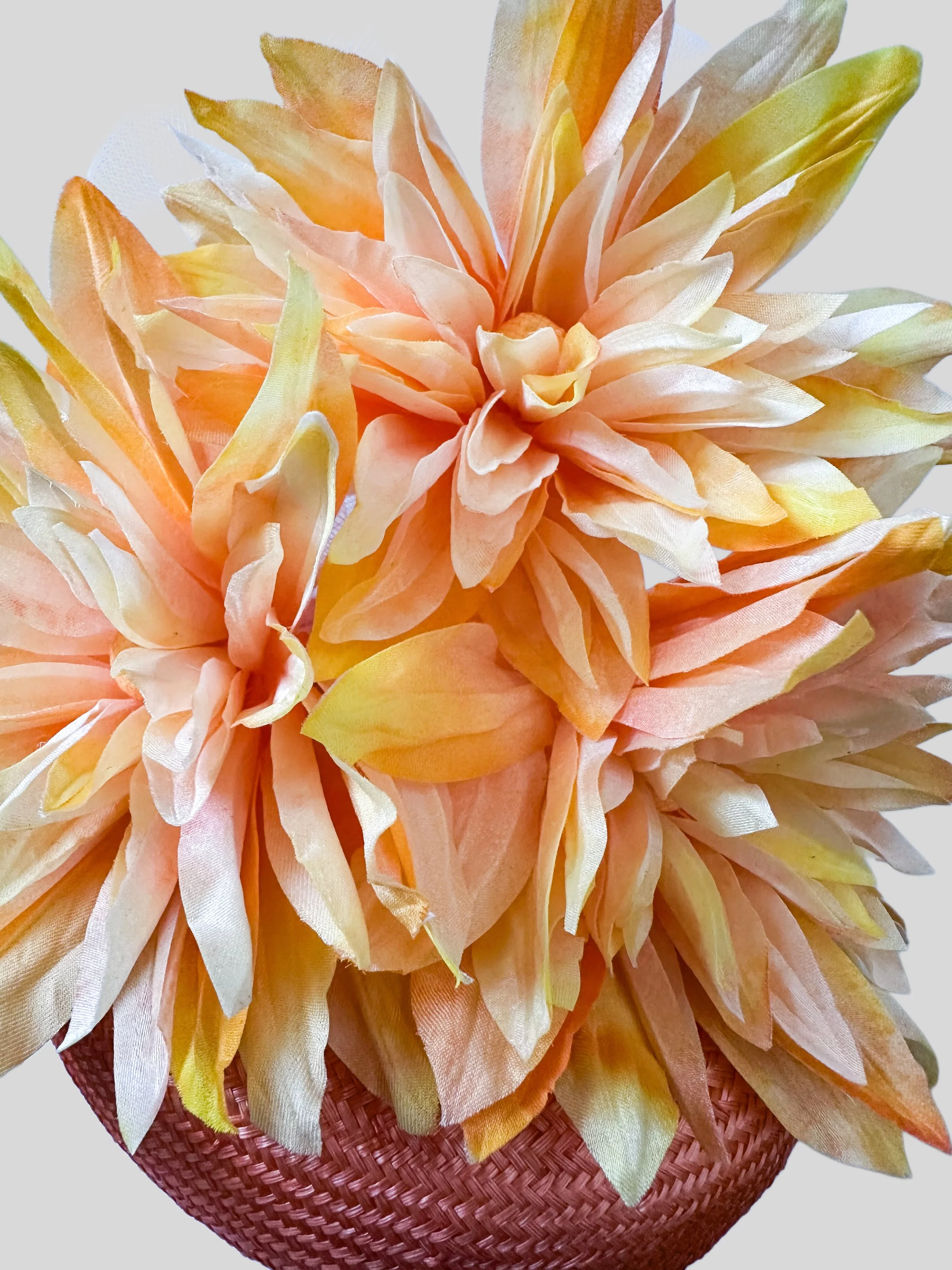 Introducing "Atardecer," a stunning orange ombre face hugger headpiece, meticulously handcrafted in Melbourne. It boasts luxurious handmade silk & satin peony, dahlia, and daisy flowers in a vibrant, classic design. Lightweight and effortless to wear, this piece includes a hat elastic for secure attachment and comes with a storage box.