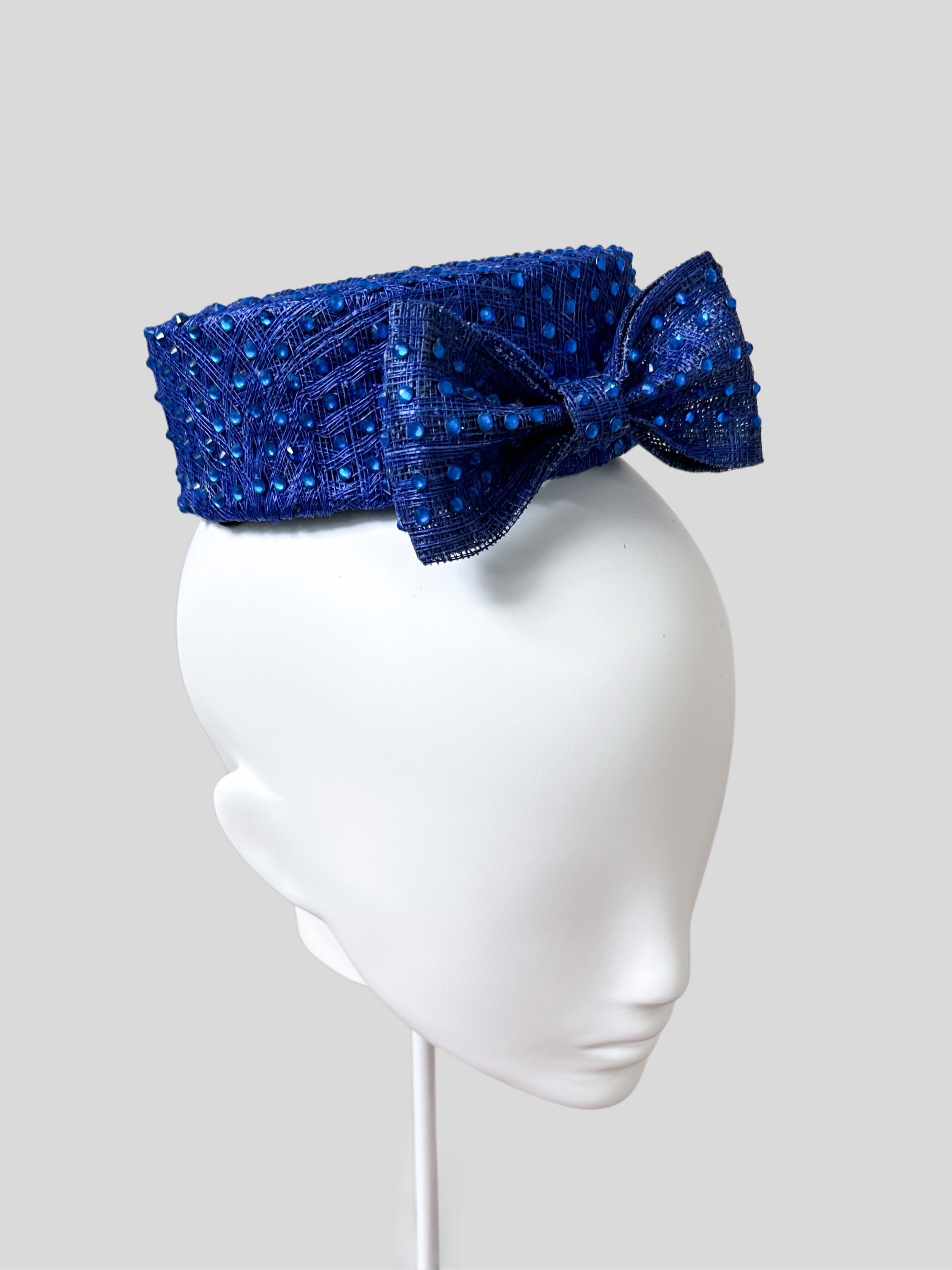 Azul Cristalino: Blue Embellished Mini Pillbox. Elevate your look with the luxurious Azul Cristalino. This unique cobalt blue Sinamay straw mini pillbox is adorned with over 700 shimmering Swarovski crystals, each meticulously hand-applied. Featuring a reversible design where the bow can be worn either at the front or the back of the head offering a touch of bespoke elegance. Lightweight and one size fits all, it's handmade in Melbourne. Secures with a hat elastic and includes a storage box.